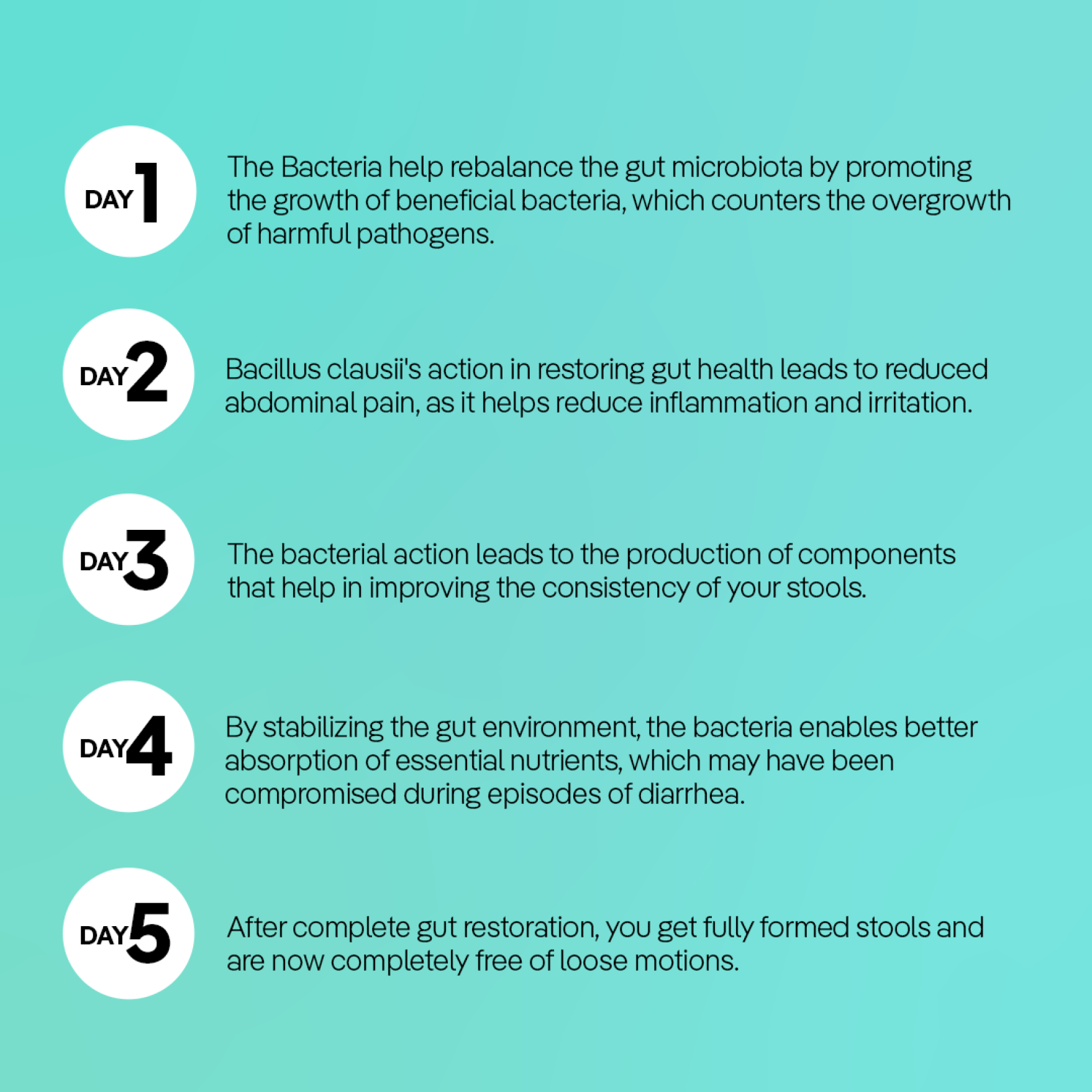 Bacillus clausii produces antimicrobial substances that act against pathogens and prevent them from replicating. Bacillus clausii multiplies exponentially promoting the regeneration of the intestinal flora, and stimulates the immune defense mechanisms directed against pathogenic bacteria. It helps restore the balance of disturbed intestinal flora and supports intestinal/gastrointestinal health. It also provides gentle relief from diarrhea and its associated symptoms, and maintains the normal balance of gut microflora.